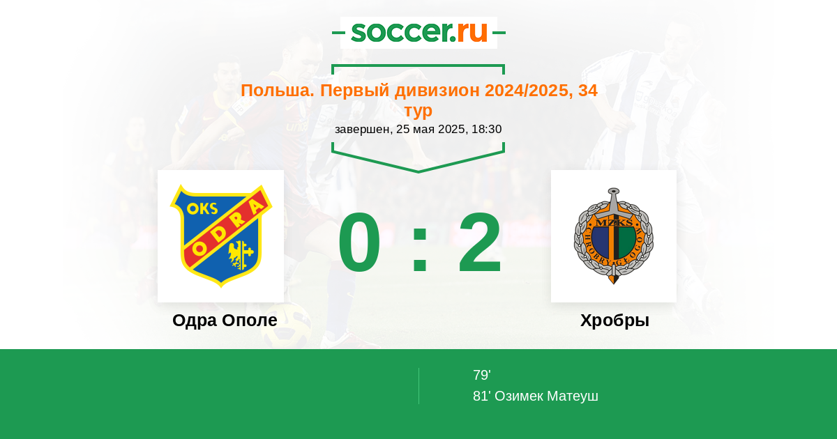 Польша. Первый дивизион 20.07.2025 Хробры Логотип футбольный клуб Хробры (Глогув) 3:0 Логотип футбольный клуб Одра Ополе Одра Ополе