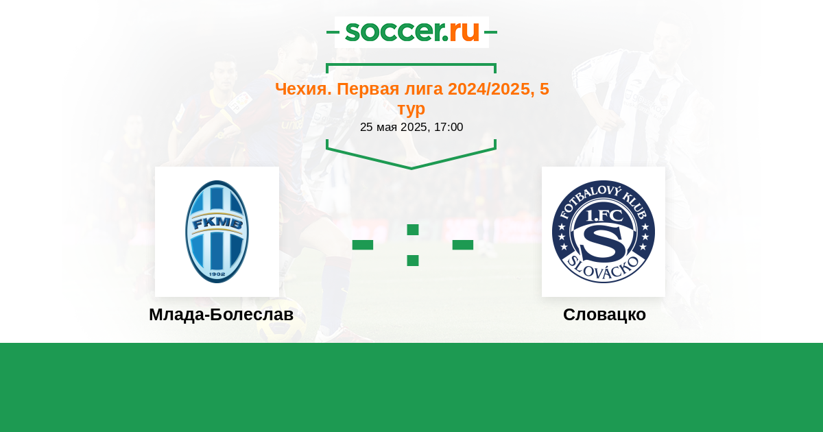 Чехия. Первая Лига 04.10.2025 Млада-Болеслав Логотип футбольный клуб Млада-Болеслав 0:0 Логотип футбольный клуб Словацко (Угерске-Градиште) Словацко