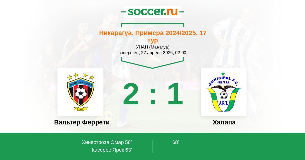 Никарагуа. Примера 08.04.2024 Халапа Логотип футбольный клуб Халапа (Окоталь) 2:0 Логотип футбольный клуб Вальтер Феррети (Манагуа) Вальтер Феррети