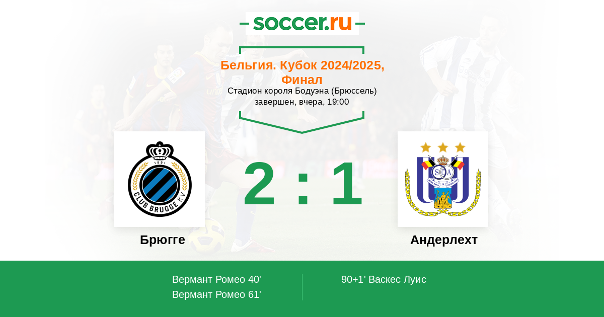 Бельгия. Про-Лига 18.05.2025 Андерлехт Логотип футбольный клуб Андерлехт (Брюссель) 1:3 Логотип футбольный клуб Брюгге Брюгге