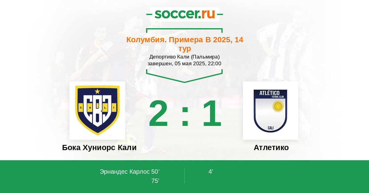Колумбия. Примера B 09.09.2025 Бока Хуниорс Кали Логотип футбольный клуб Бока Хуниорс Кали (Сантьяго-де-Кали) 1:2 Логотип футбольный клуб Атлетико Кали Атлетико Кали