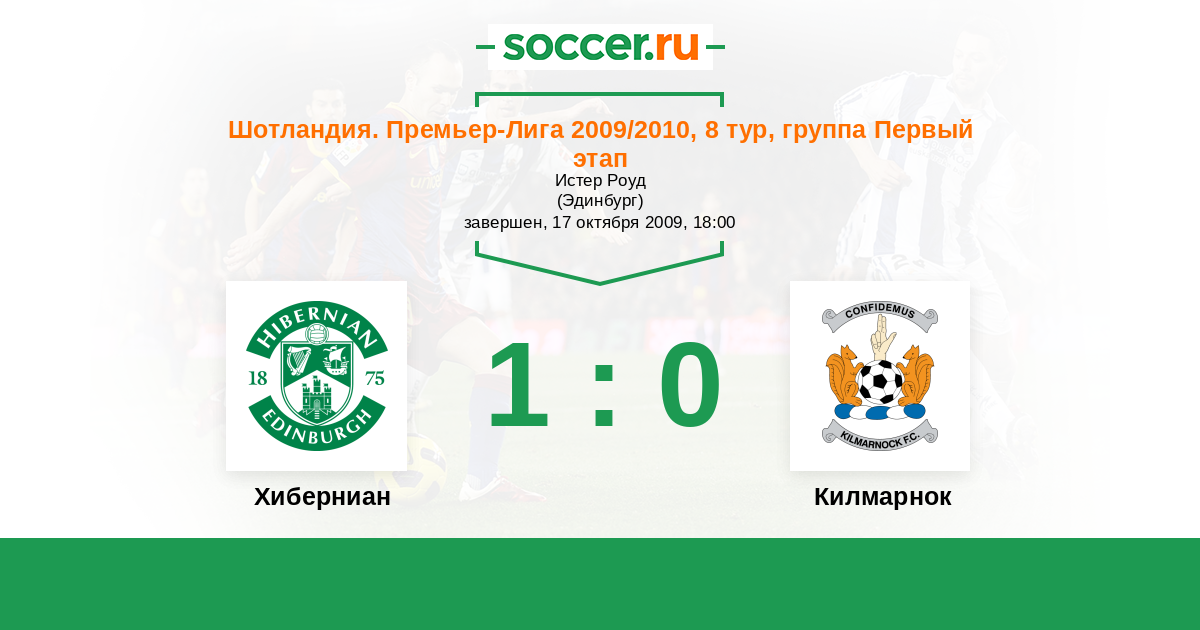 Шотландия. Премьер-Лига 16.10.2010 Хиберниан Логотип футбольный клуб Хиберниан (Эдинбург) 2:1 Логотип футбольный клуб Килмарнок Килмарнок