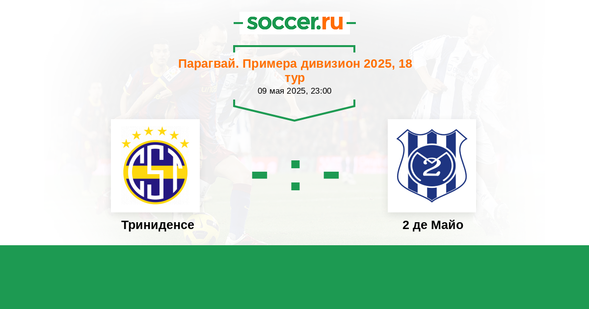 Парагвай. Второй дивизион 26.05.2019 Триниденсе Логотип футбольный клуб Триниденсе (Асунсьон) 1:1 Логотип футбольный клуб 2 де Майо (Педро-Хуан-Кабальеро) 2 де Майо