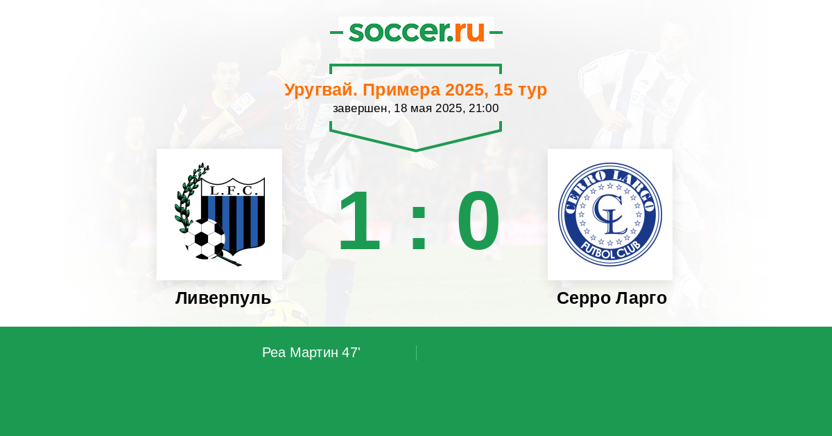 Уругвай. Примера A 07.06.2025 Ливерпуль Логотип футбольный клуб Ливерпуль (Монтевидео) 2:1 Логотип футбольный клуб Серро Ларго (Мело) Серро Ларго