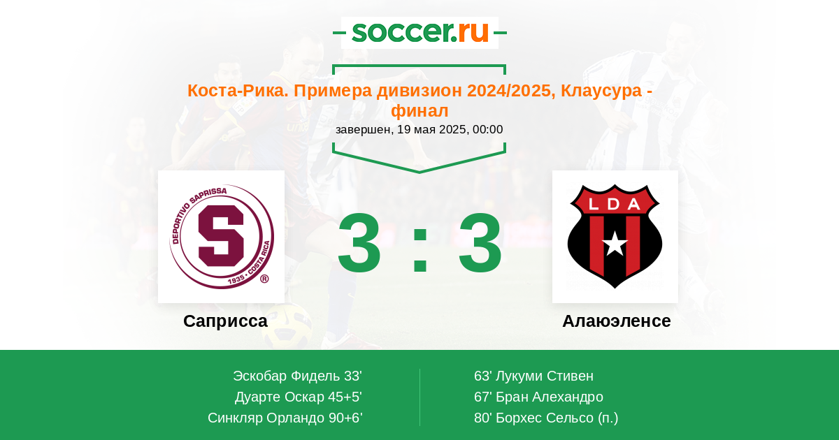 Коста-Рика. Примера дивизион 13.05.2018 Саприсса Логотип футбольный клуб Саприсса (Сан Хосе) 1:1 Логотип футбольный клуб Алаюэленсе (Алаюэла) Алаюэленсе