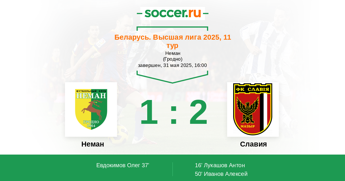 Беларусь. Высшая лига 02.06.2019 Неман Логотип футбольный клуб Неман (Гродно) 0:1 Логотип футбольный клуб Славия (Мозырь) Славия