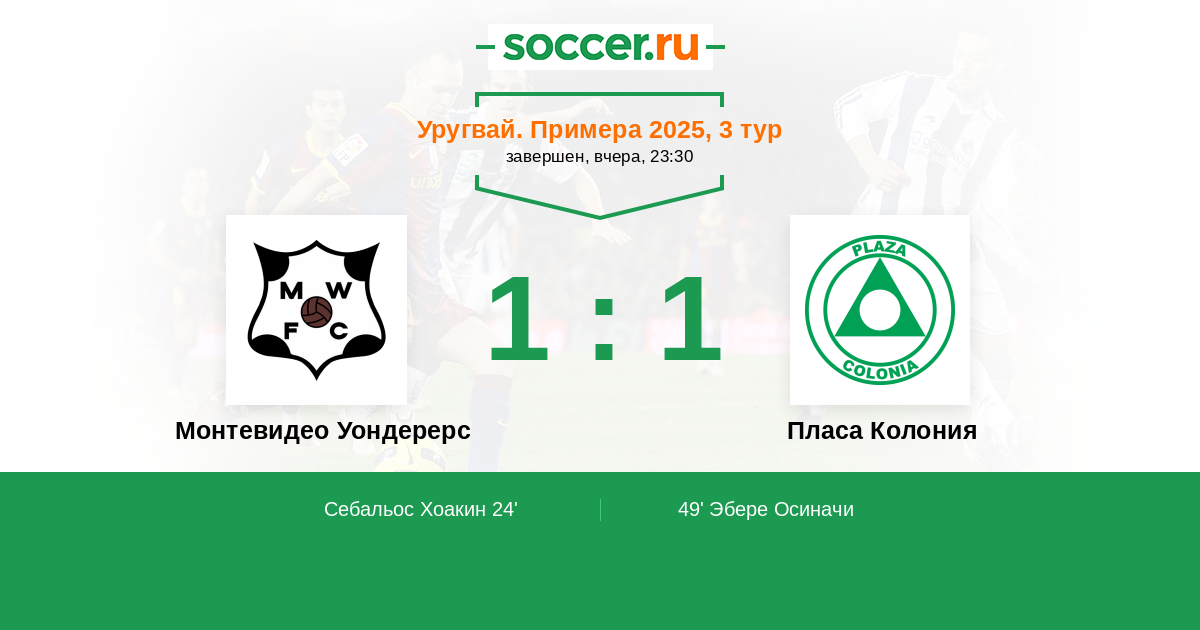 Уругвай. Примера A 17.10.2022 Монтевидео Уондерерс Логотип футбольный клуб Монтевидео Уондерерс 2:1 Логотип футбольный клуб Пласа Колония (Колония-дель-Сакраменто) Пласа Колония