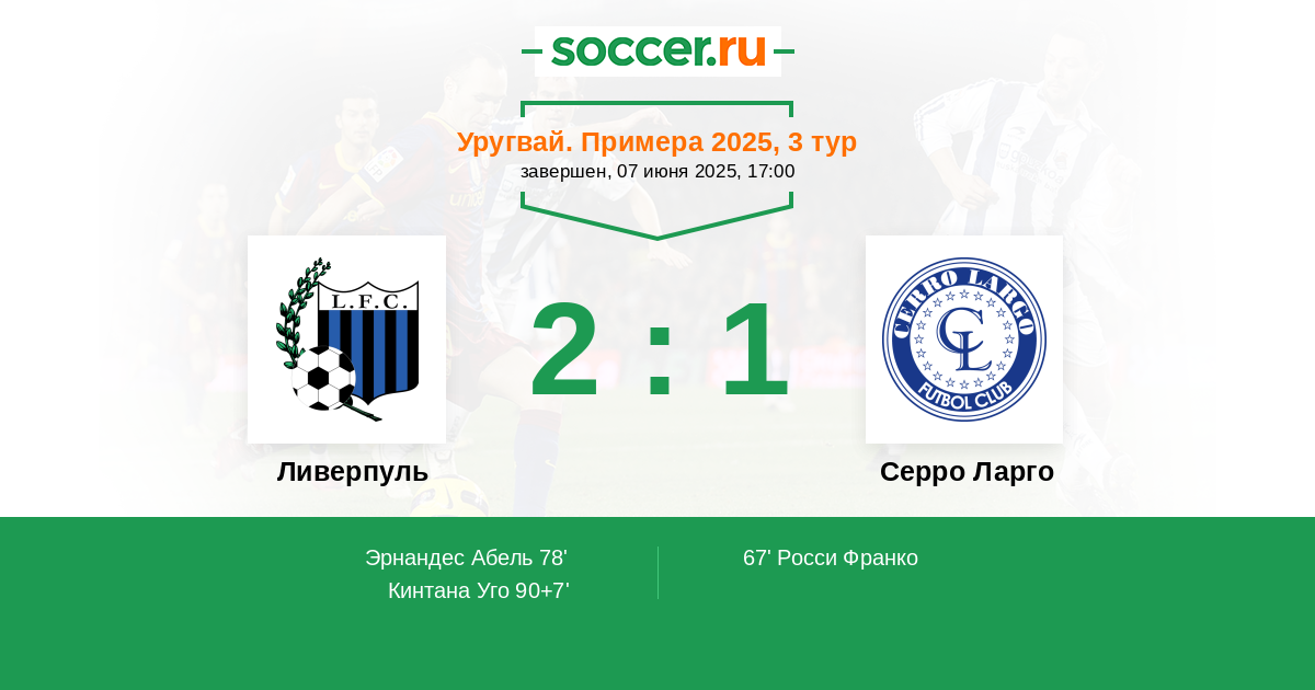Уругвай. Примера A 18.05.2025 Ливерпуль Логотип футбольный клуб Ливерпуль (Монтевидео) 1:0 Логотип футбольный клуб Серро Ларго (Мело) Серро Ларго