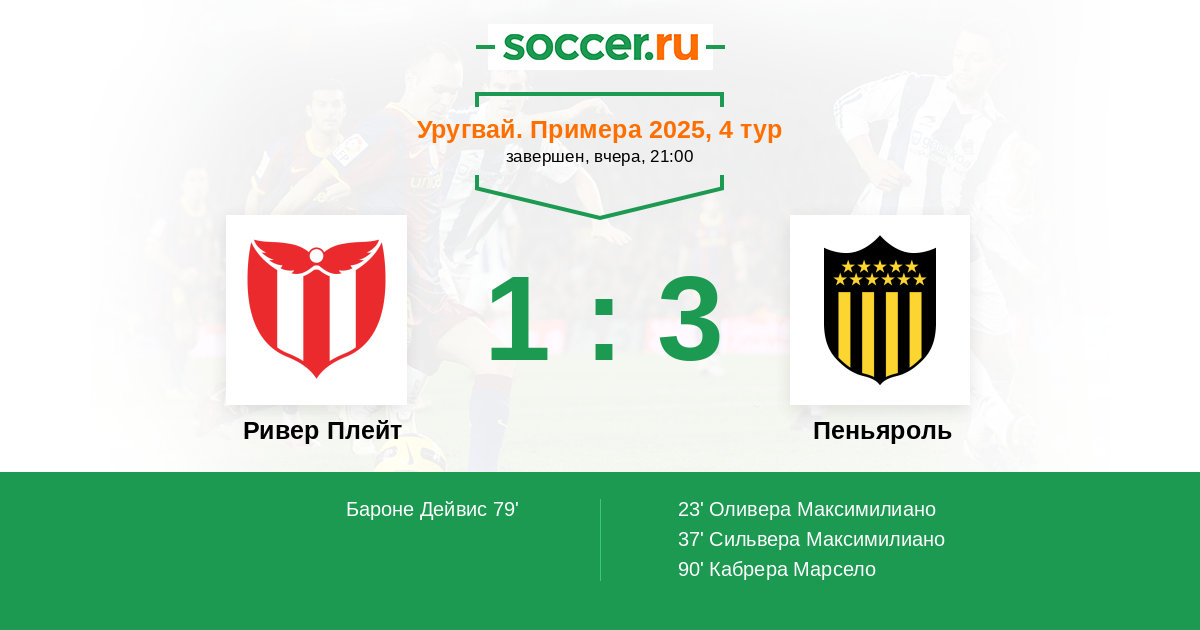 Уругвай. Примера A 02.08.2021 Пеньяроль Логотип футбольный клуб Пеньяроль (Монтевидео) 2:0 Логотип футбольный клуб Ривер Плейт (Монтевидео) Ривер Плейт