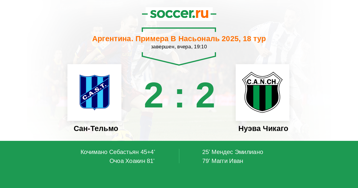 Аргентина. Примера Б Насьональ 05.06.2022 Сан-Тельмо Логотип футбольный клуб Сан-Тельмо 1:1 Логотип футбольный клуб Нуэва Чикаго ( Матадерос) Нуэва Чикаго