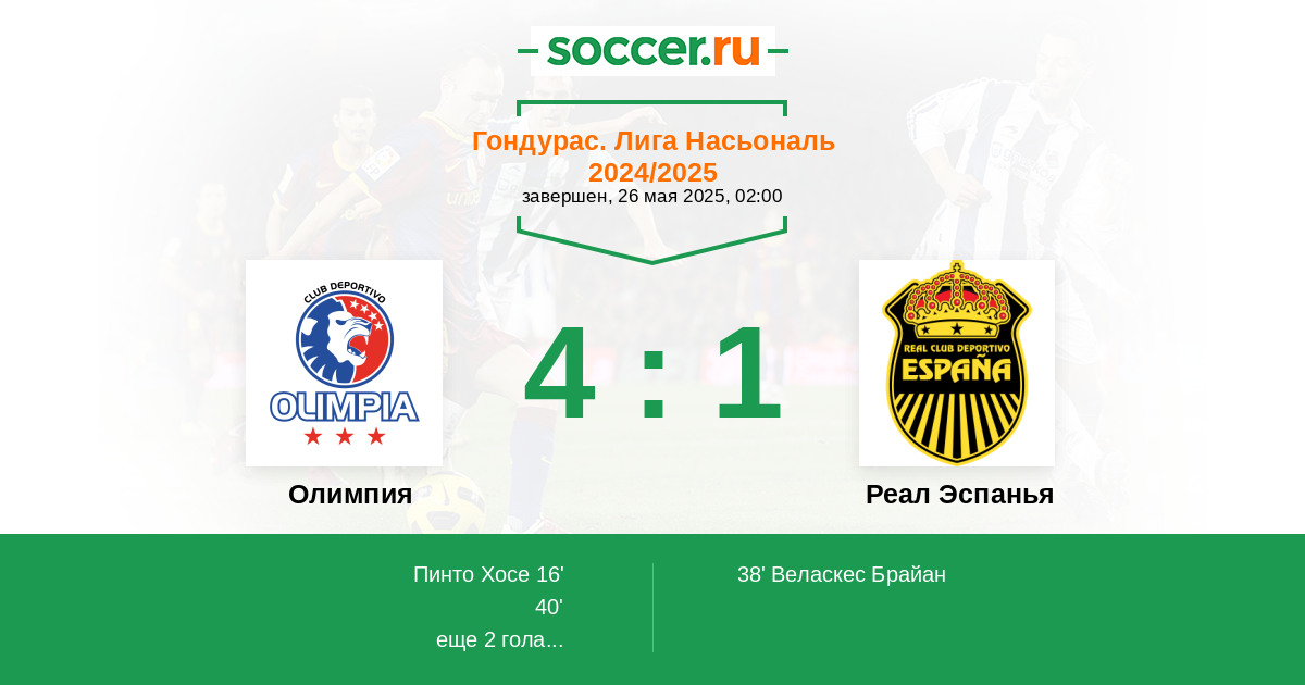 Гондурас. Лига Насьональ 28.12.2025 Олимпия Логотип футбольный клуб Олимпия (Тегусигальпа) 1:0 Логотип футбольный клуб Реал Эспанья (Сан-Педро-Сула) Реал Эспанья