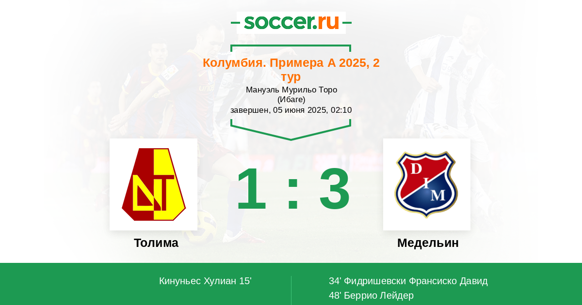 Колумбия. Примера А 16.06.2025 Медельин Логотип футбольный клуб Медельин 2:1 Логотип футбольный клуб Толима (Ибаге) Толима
