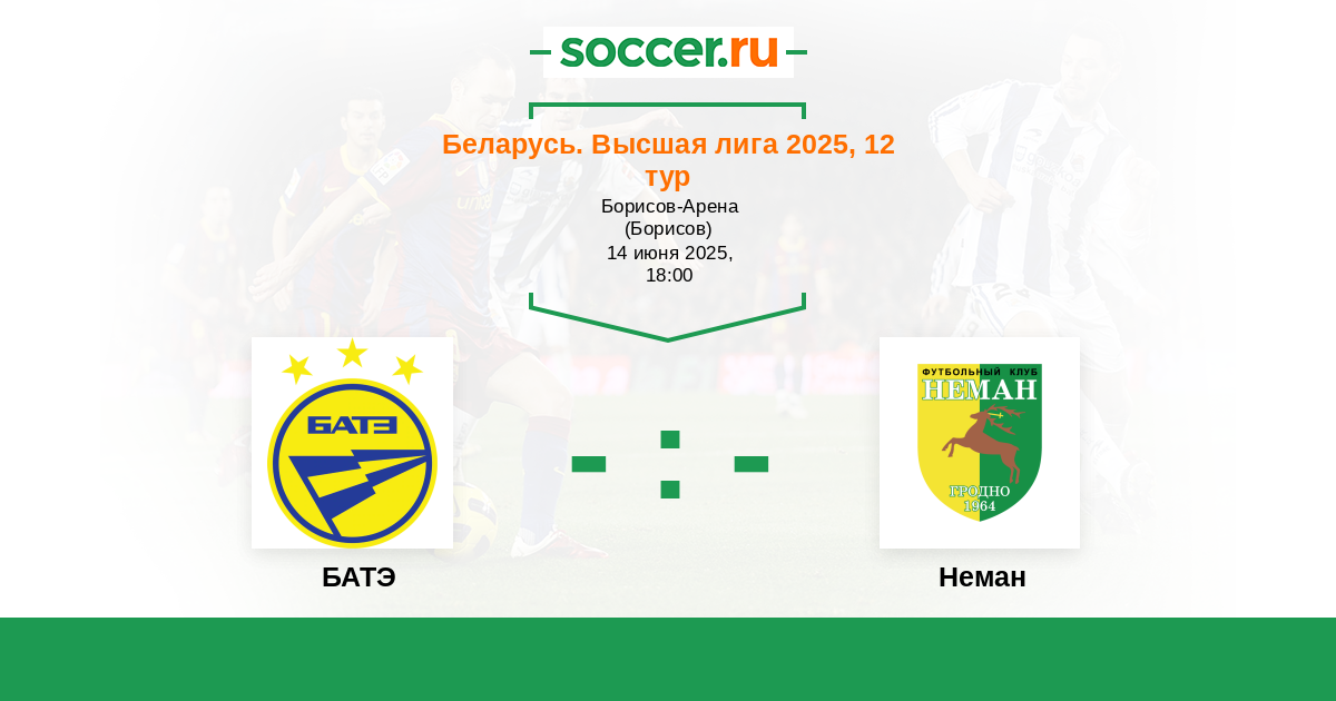 Беларусь. Высшая лига 25.06.2017 Неман Логотип футбольный клуб Неман (Гродно) 0:1 Логотип футбольный клуб БАТЭ (Борисов) БАТЭ