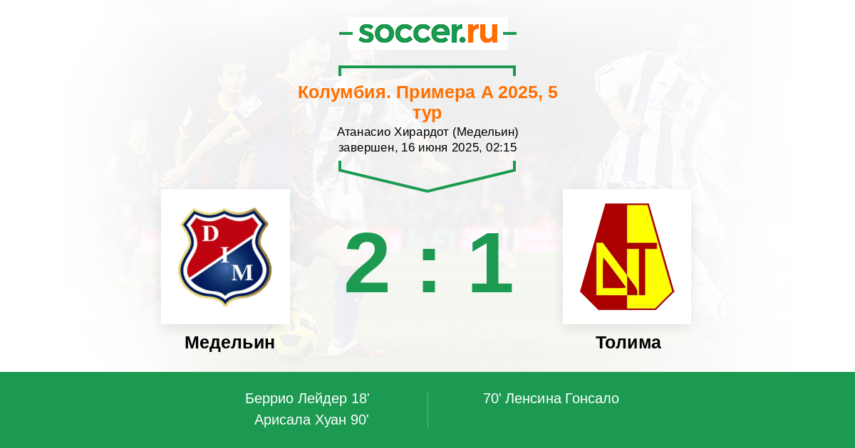 Колумбия. Примера А 05.06.2025 Толима Логотип футбольный клуб Толима (Ибаге) 1:3 Логотип футбольный клуб Медельин Медельин