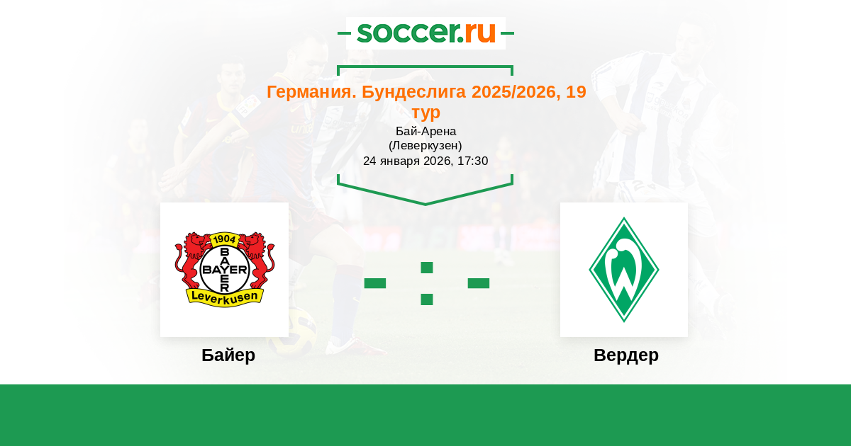 Германия. Бундеслига 26.10.2024 Вердер Логотип футбольный клуб Вердер (Бремен) 2:2 Логотип футбольный клуб Байер (Леверкузен) Байер