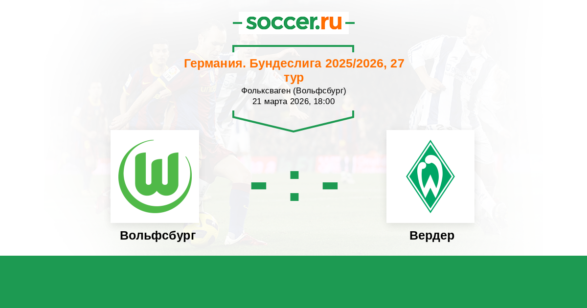 Германия. Бундеслига 30.03.2024 Вердер Логотип футбольный клуб Вердер (Бремен) 0:2 Логотип футбольный клуб Вольфсбург Вольфсбург