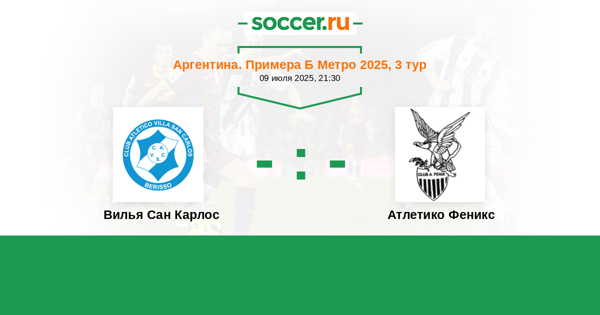 Аргентина. Примера Б Метро 12.03.2022 Вилья Сан Карлос Логотип футбольный клуб Вилья Сан Карлос (Берисо) 0:0 Логотип футбольный клуб Атлетико Феникс (Пилар) Атлетико Феникс