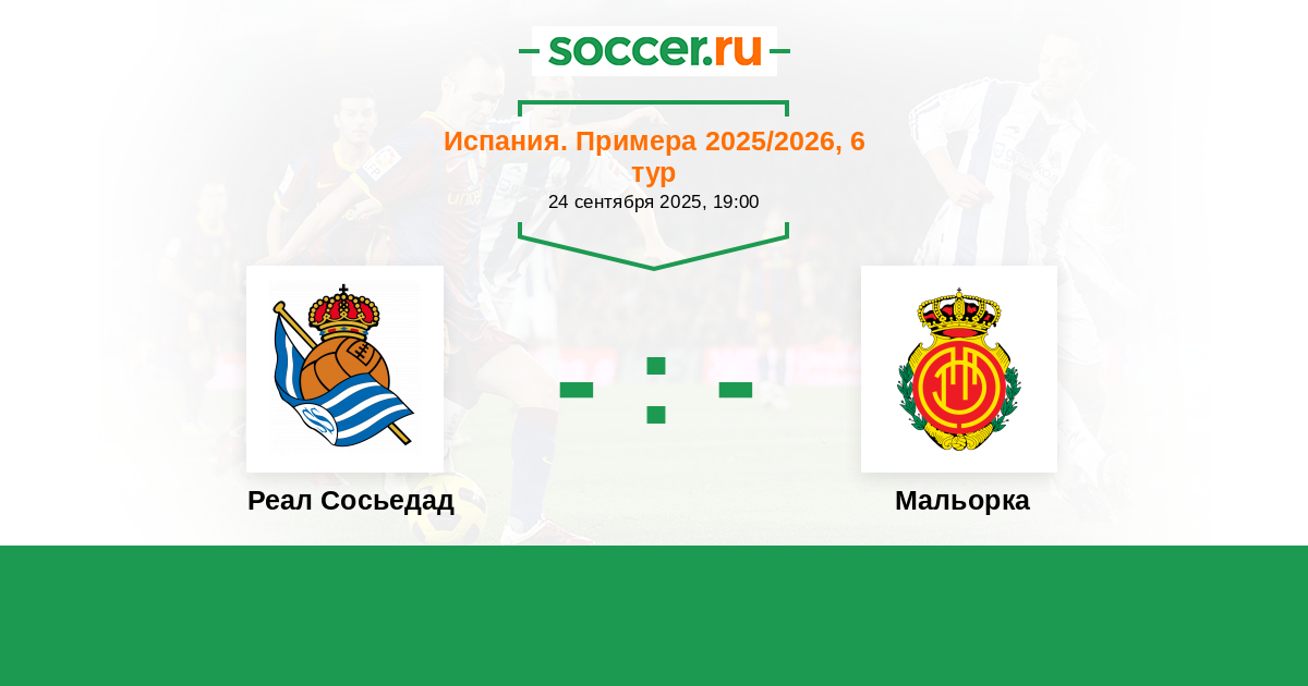 Испания. Примера 17.09.2024 Мальорка Логотип футбольный клуб Мальорка (Пальма-де-Мальорка) 1:0 Логотип футбольный клуб Реал Сосьедад (Сан-Себастьян) Реал Сосьедад