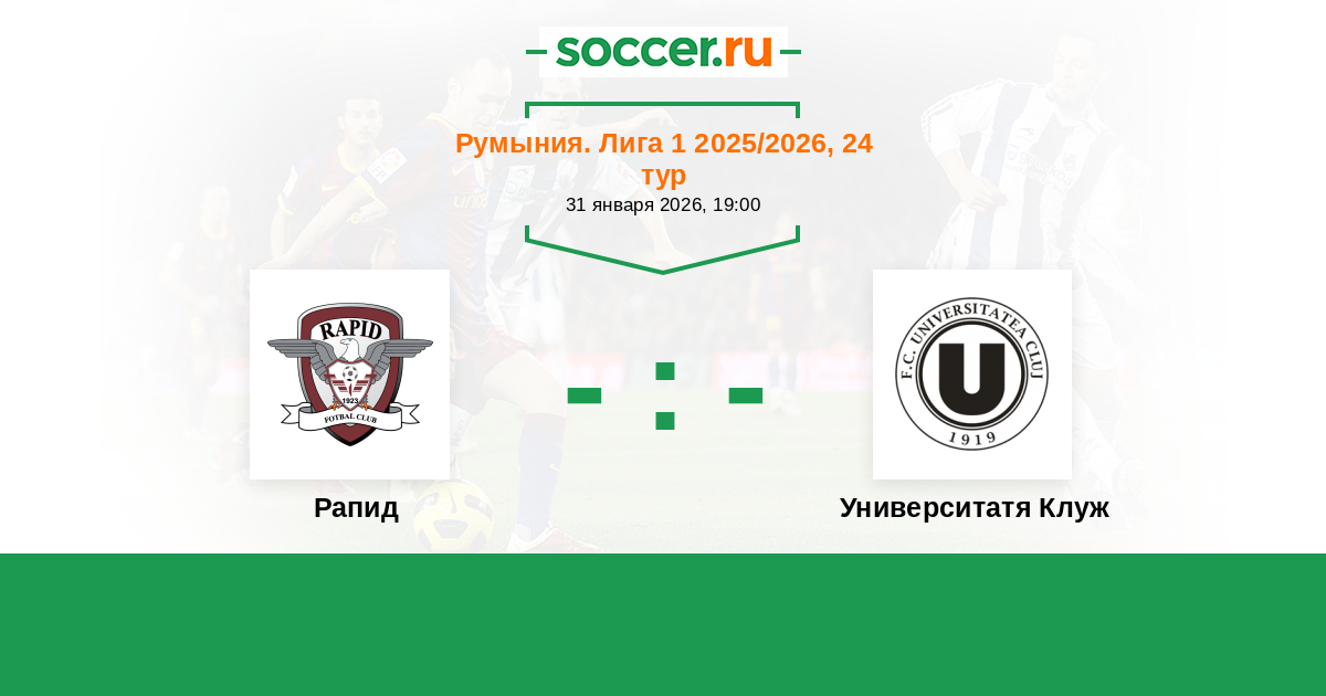 Румыния. Лига 1 12.09.2025 Университатя Клуж Логотип футбольный клуб Университатя Клуж 0:0 Логотип футбольный клуб Рапид (Бухарест) Рапид