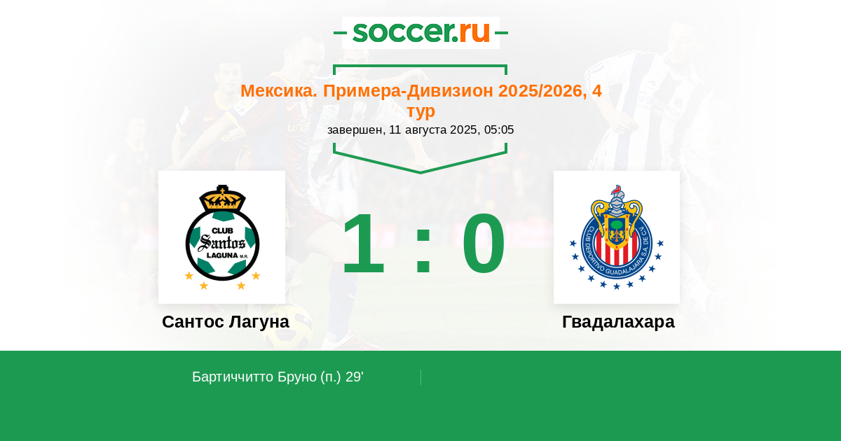 Мексика. Примера-Дивизион 27.08.2023 Сантос Лагуна Логотип футбольный клуб Сантос Лагуна (Торреон) 2:1 Логотип футбольный клуб Гвадалахара Гвадалахара