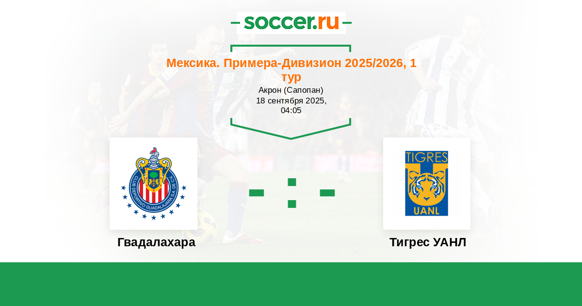 Мексика. Примера-Дивизион 26.01.2025 Гвадалахара Логотип футбольный клуб Гвадалахара 1:1 Логотип футбольный клуб Тигрес УАНЛ (Монтеррей) Тигрес УАНЛ