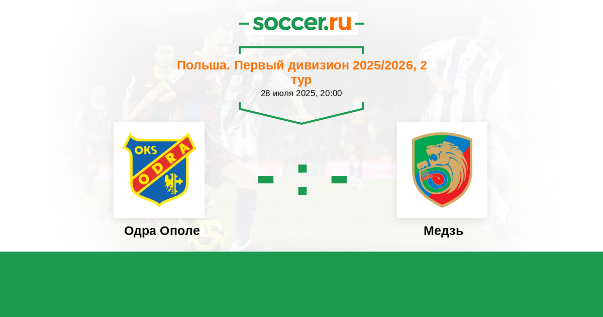 Польша. Первый дивизион 27.07.2019 Медзь Логотип футбольный клуб Медзь (Легница) 0:0 Логотип футбольный клуб Одра Ополе Одра Ополе