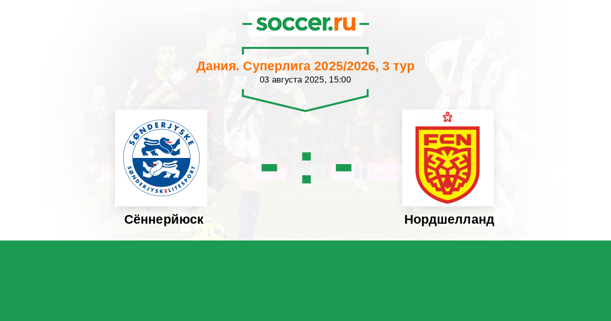 Дания. Суперлига 02.08.2021 Сённерйюск Логотип футбольный клуб Сённерйюск (Хадерслев) 0:2 Логотип футбольный клуб Нордшелланд (Фарум) Нордшелланд
