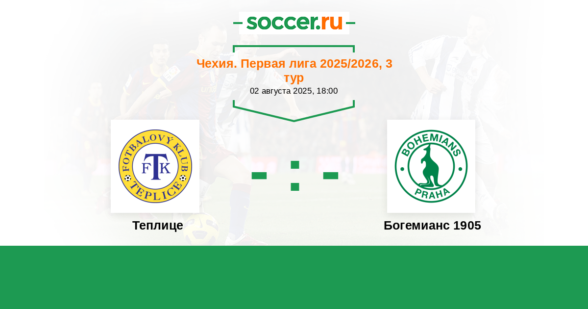 Чехия. Первая Лига 15.09.2017 Теплице Логотип футбольный клуб Теплице 0:0 Логотип футбольный клуб Богемианс 1905 (Прага) Богемианс 1905