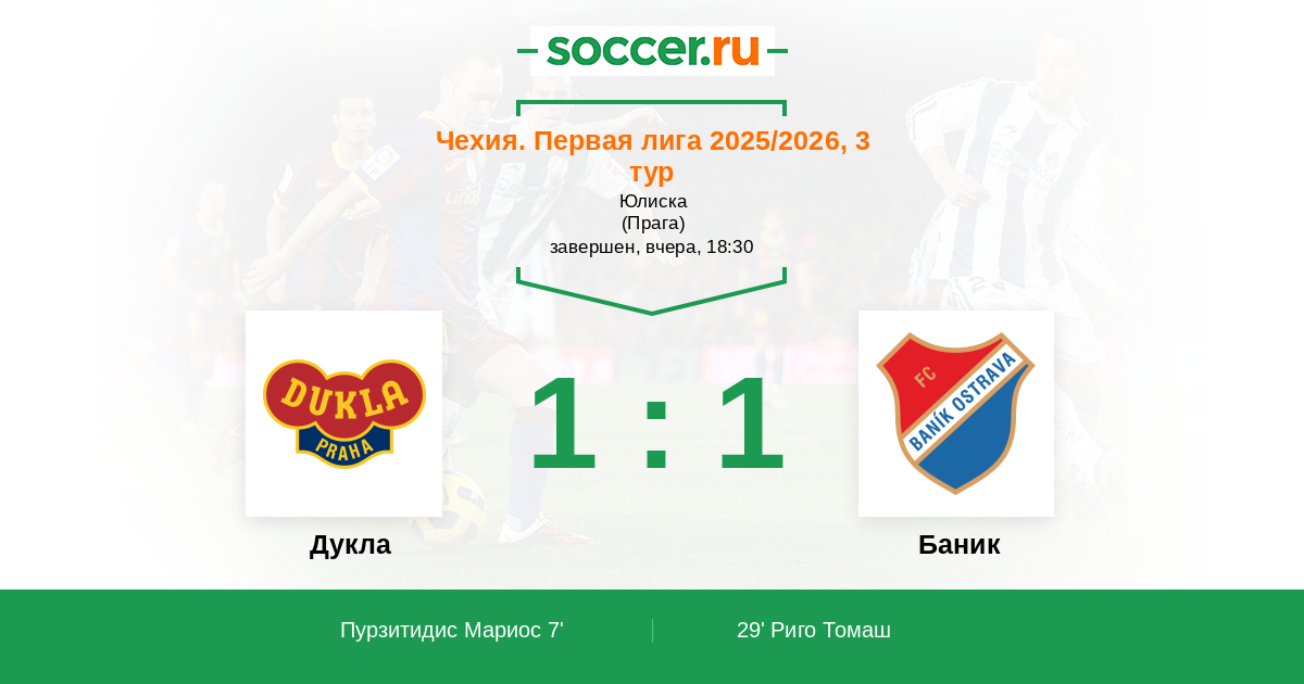 Чехия. Первая Лига 14.09.2015 Дукла Логотип футбольный клуб Дукла (Прага) 4:1 Логотип футбольный клуб Баник (Острава) Баник