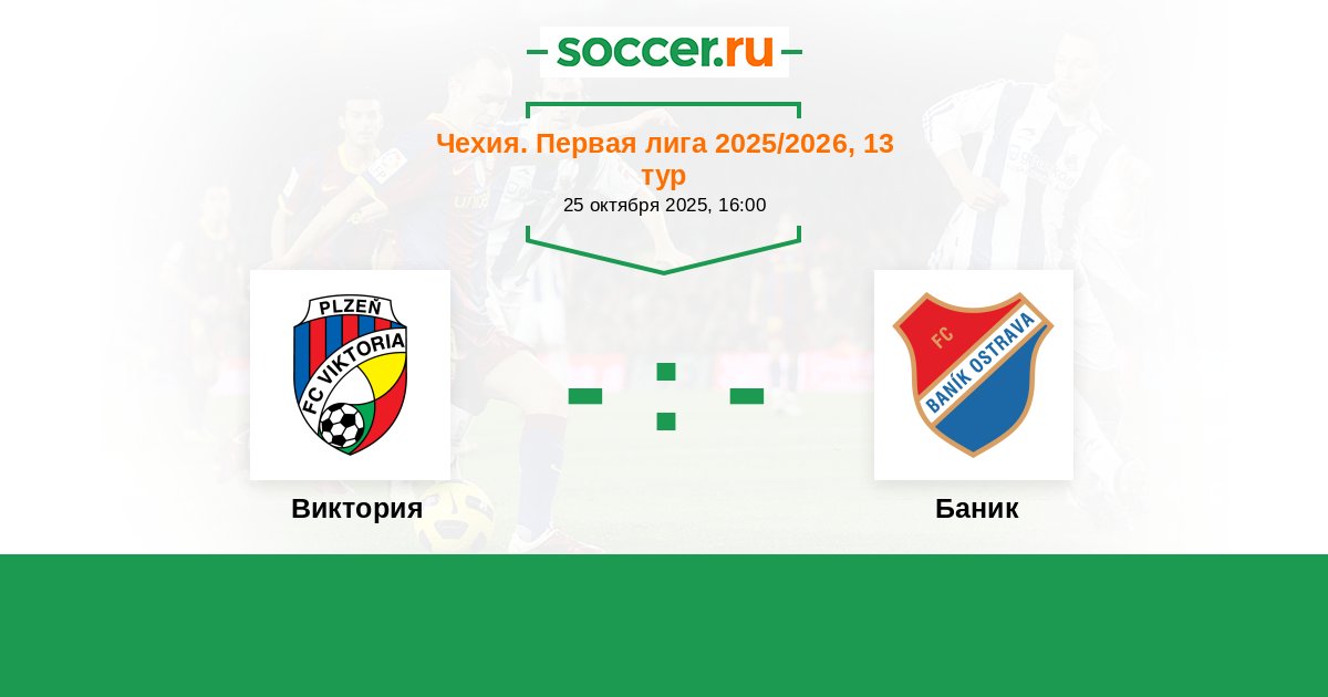 Чехия. Первая Лига 19.10.2024 Баник Логотип футбольный клуб Баник (Острава) 1:3 Логотип футбольный клуб Виктория (Пльзень) Виктория