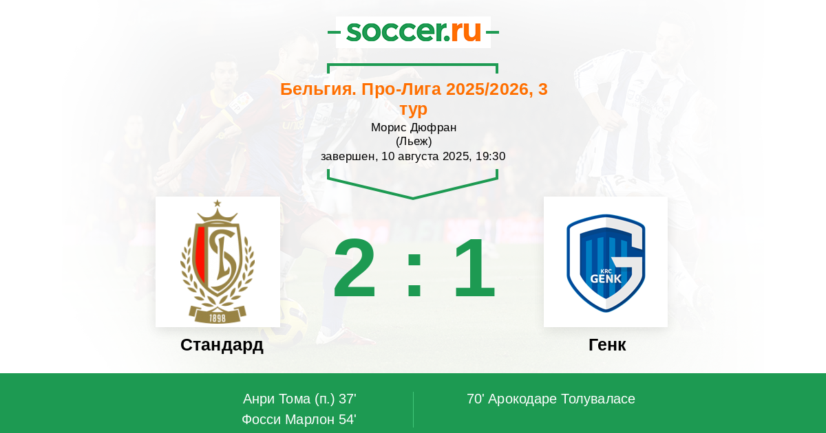 Бельгия. Про-Лига 19.10.2019 Стандард Логотип футбольный клуб Стандард (Льеж) 1:0 Логотип футбольный клуб Генк Генк