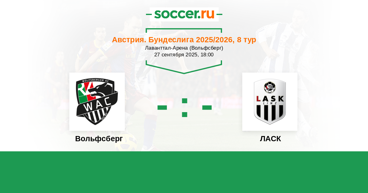 Австрия. Бундеслига 01.09.2024 ЛАСК Логотип футбольный клуб ЛАСК (Линц) 1:5 Логотип футбольный клуб Вольфсберг Вольфсберг