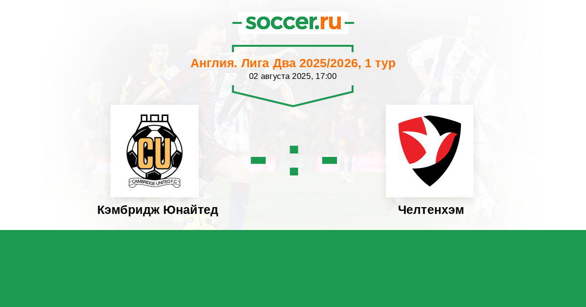 Англия. Вторая Футбольная Лига 25.08.2018 Кэмбридж Юнайтед Логотип футбольный клуб Кэмбридж Юнайтед 0:1 Логотип футбольный клуб Челтенхэм Челтенхэм