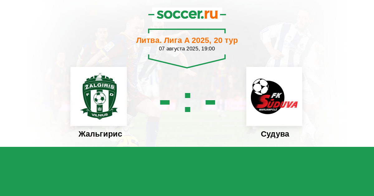 Литва. Лига А 09.08.2017 Жальгирис Логотип футбольный клуб Жальгирис (Вильнюс) 1:1 Логотип футбольный клуб Судува (Мариямполе) Судува