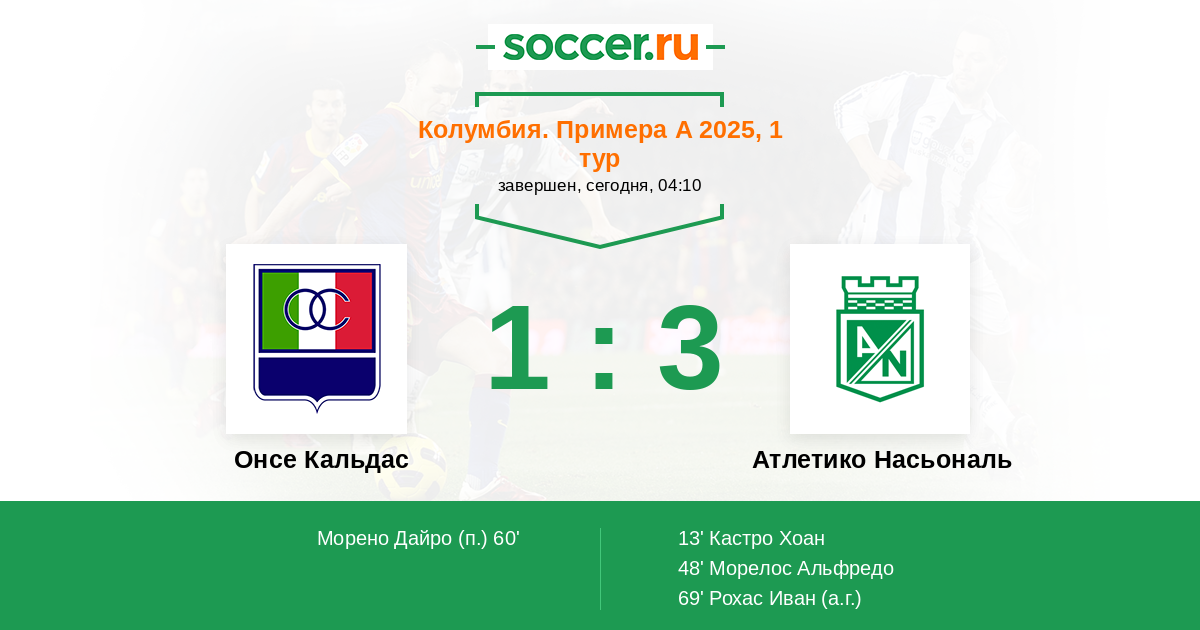 Колумбия. Примера А 26.01.2025 Атлетико Насьональ Логотип футбольный клуб Атлетико Насьональ (Медельин) 4:0 Логотип футбольный клуб Онсе Кальдас (Манисалес) Онсе Кальдас