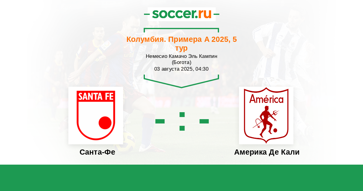 Колумбия. Примера А 05.08.2018 Америка Де Кали Логотип футбольный клуб Америка Де Кали 0:0 Логотип футбольный клуб Санта-Фе (Богота) Санта-Фе