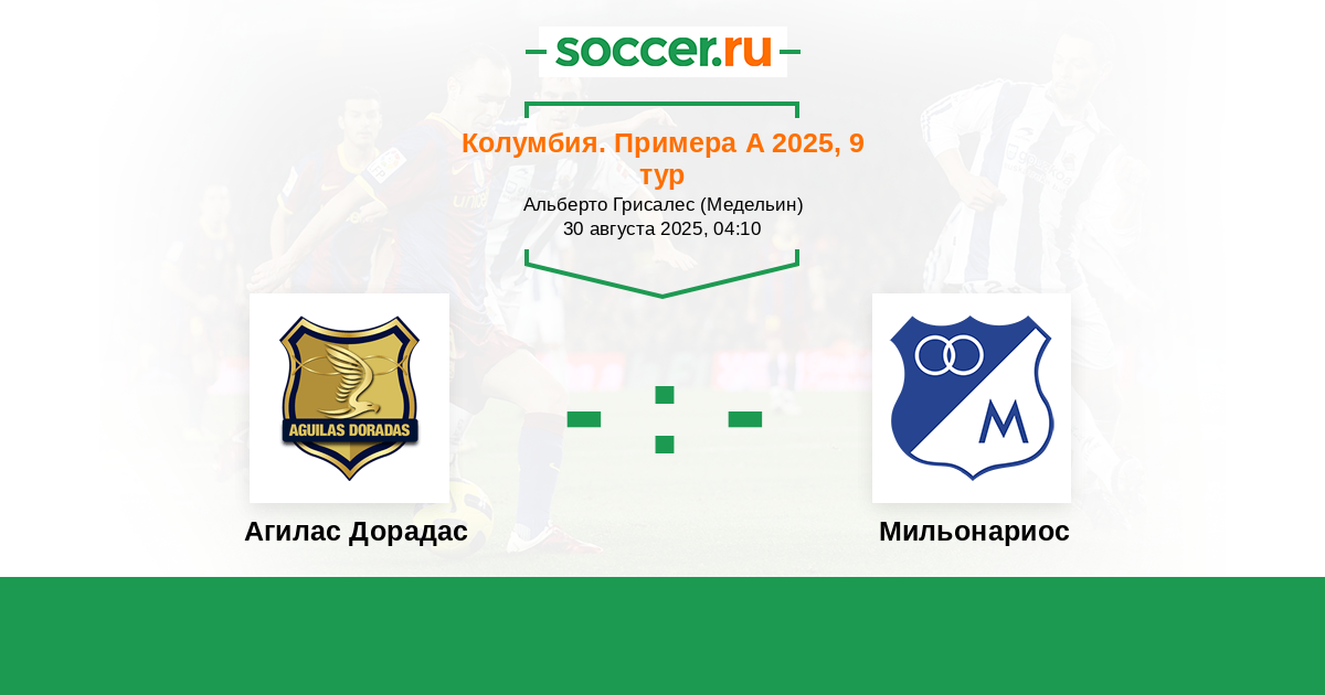 Колумбия. Примера А 26.08.2024 Агилас Дорадас Логотип футбольный клуб Агилас Дорадас (Рионегро) 2:1 Логотип футбольный клуб Мильонариос (Богота) Мильонариос