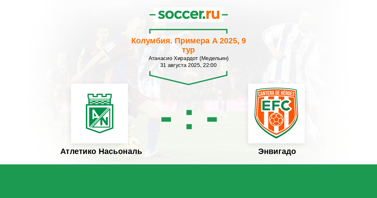 Колумбия. Примера А 02.09.2022 Атлетико Насьональ Логотип футбольный клуб Атлетико Насьональ (Медельин) 1:1 Логотип футбольный клуб Энвигадо Энвигадо