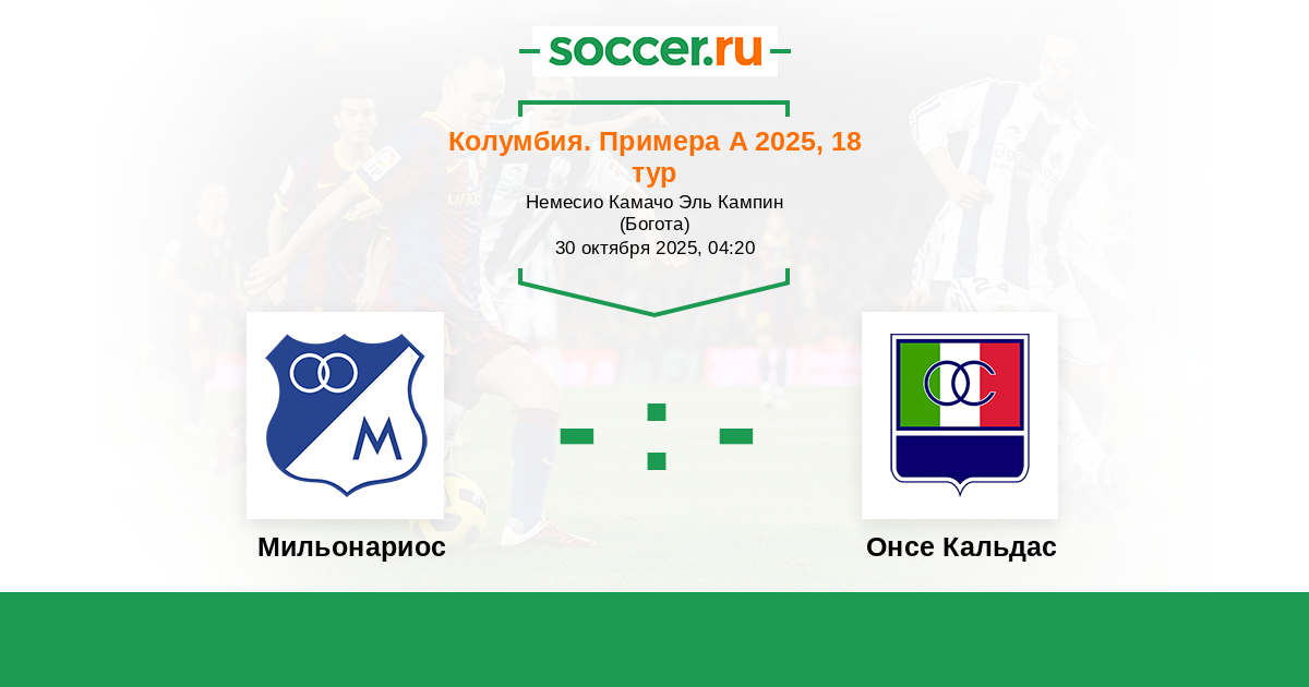 Колумбия. Примера А 23.09.2018 Мильонариос Логотип футбольный клуб Мильонариос (Богота) 2:2 Логотип футбольный клуб Онсе Кальдас (Манисалес) Онсе Кальдас