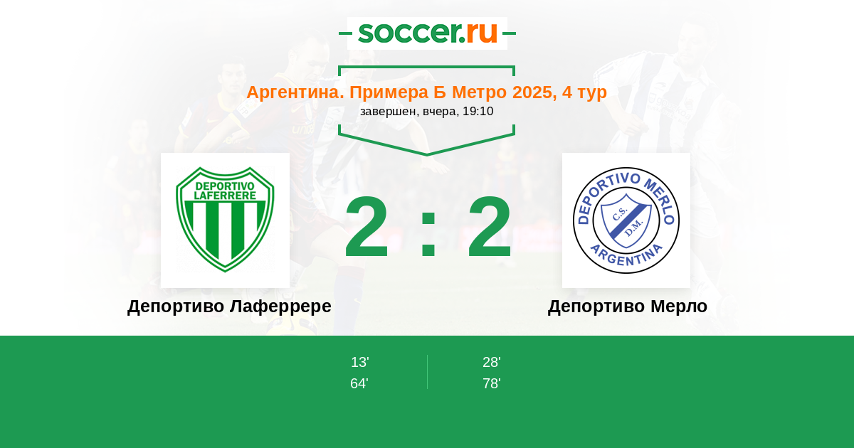 Аргентина. Примера Б Метро 19.05.2024 Депортиво Лаферрере Логотип футбольный клуб Депортиво Лаферрере 1:0 Логотип футбольный клуб Депортиво Мерло Депортиво Мерло