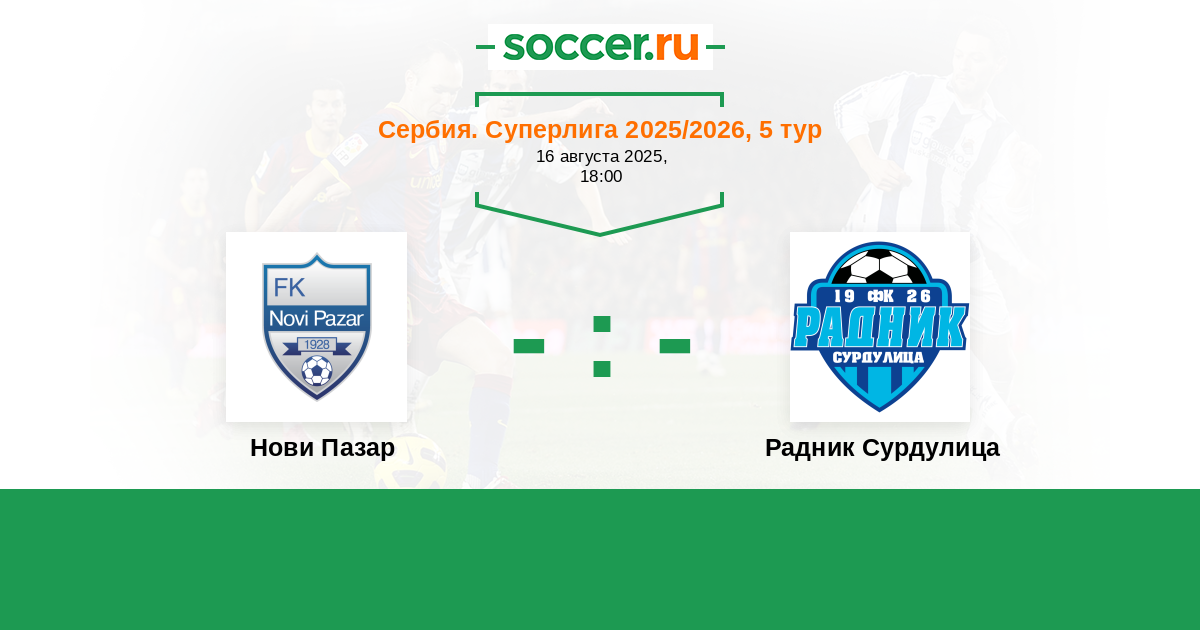 Сербия. Суперлига 20.08.2023 Радник Сурдулица Логотип футбольный клуб Радник Сурдулица 0:0 Логотип футбольный клуб Нови Пазар Нови Пазар