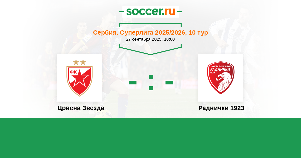 Сербия. Суперлига 08.10.2023 Раднички 1923 Логотип футбольный клуб Раднички 1923 (Крагуевац) 3:4 Логотип футбольный клуб Црвена Звезда (Белград) Црвена Звезда