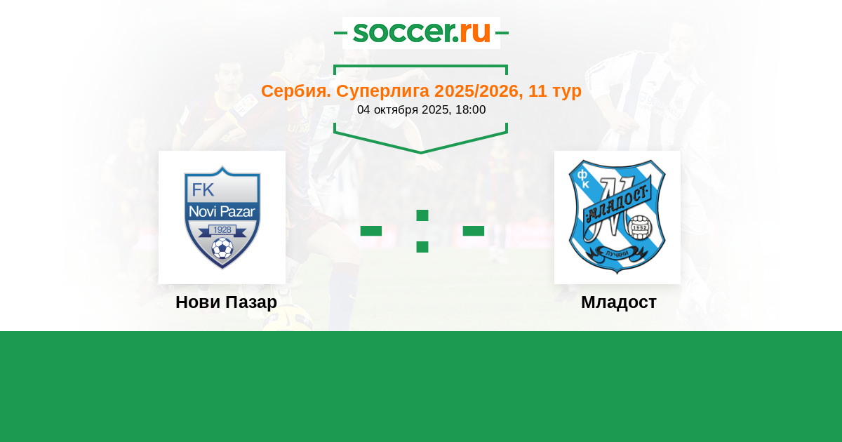 Сербия. Суперлига 03.10.2021 Младост Логотип футбольный клуб Младост (Лучани) 3:0 Логотип футбольный клуб Нови Пазар Нови Пазар