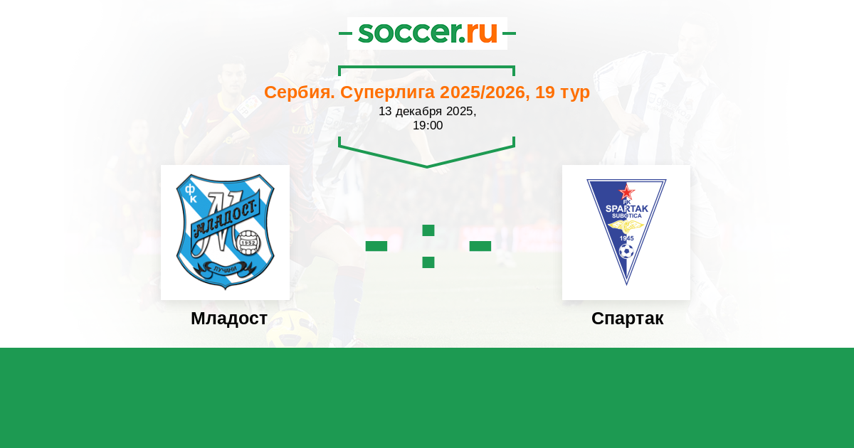 Сербия. Суперлига 15.09.2019 Младост Логотип футбольный клуб Младост (Лучани) 2:0 Логотип футбольный клуб Спартак Суботица Спартак Суботица