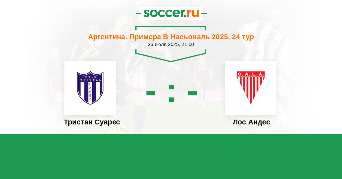 Аргентина. Примера Б Насьональ 24.03.2025 Лос Андес Логотип футбольный клуб Лос Андес (Ломас-де-Самора) 2:0 Логотип футбольный клуб Тристан Суарес (Эсейса) Тристан Суарес