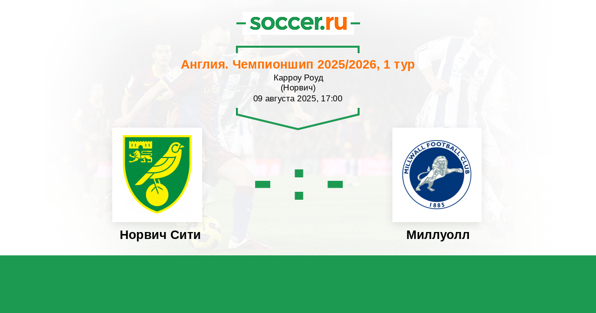 Англия. Чемпионшип 19.08.2022 Норвич Сити Логотип футбольный клуб Норвич Сити 2:0 Логотип футбольный клуб Миллуолл (Лондон) Миллуолл