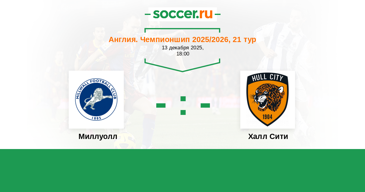 Англия. Чемпионшип 18.01.2025 Миллуолл Логотип футбольный клуб Миллуолл (Лондон) 0:1 Логотип футбольный клуб Халл Сити (Кингстон-апон-Халл) Халл Сити