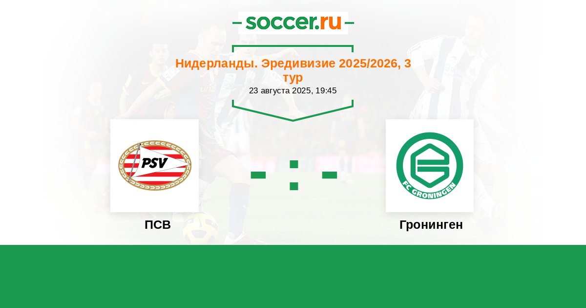 Нидерланды. Эредивизи 28.08.2021 ПСВ Логотип футбольный клуб ПСВ (Эйндховен) 5:2 Логотип футбольный клуб Гронинген Гронинген