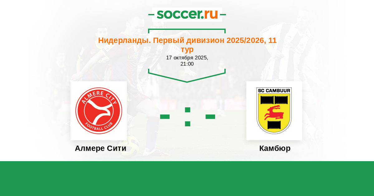 Нидерланды. Первый дивизион 20.10.2017 Алмере Сити Логотип футбольный клуб Алмере Сити 1:1 Логотип футбольный клуб Камбюр (Лиуварден) Камбюр