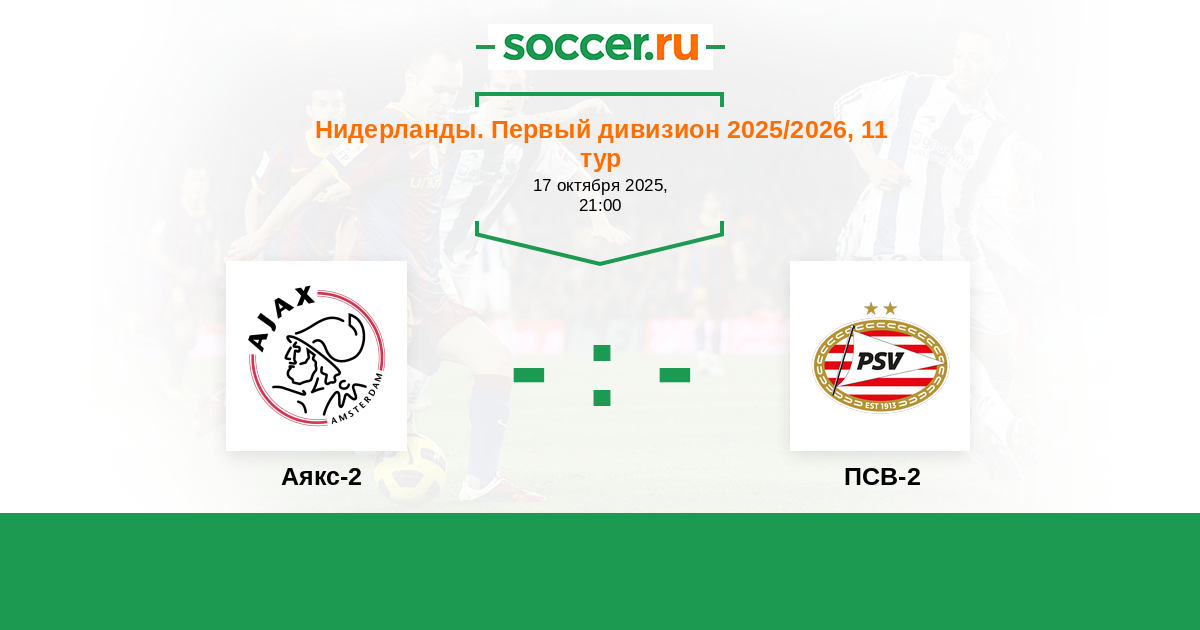 Нидерланды. Первый дивизион 24.10.2014 Аякс-2 Логотип футбольный клуб Аякс-2 (Амстердам) 1:1 Логотип футбольный клуб ПСВ-2 (Эйндховен) ПСВ-2